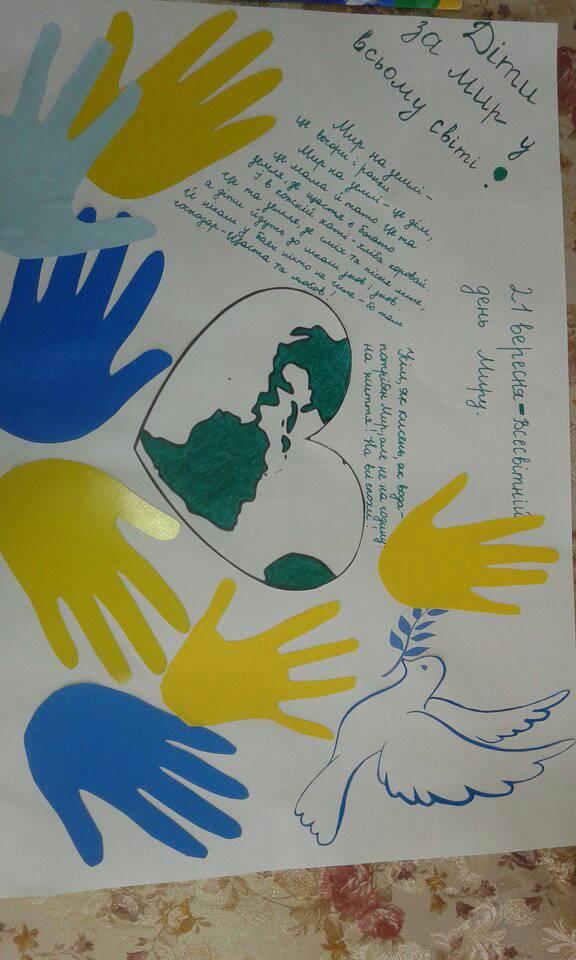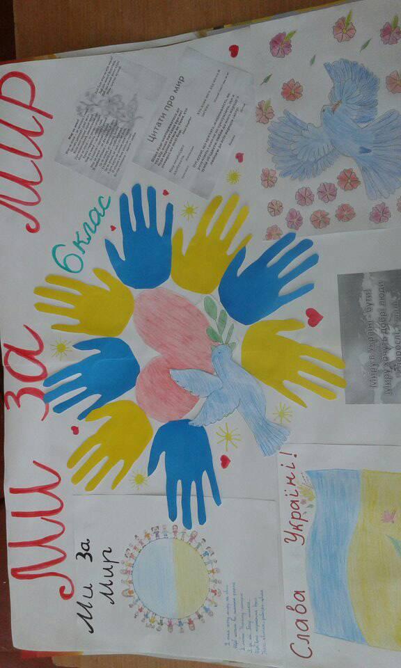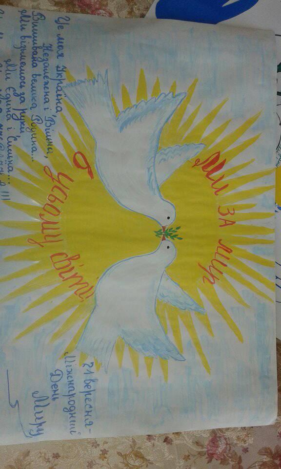 21 вересня Генеральна Асамблея ООН проголосила Міжнародним днем миру. Це день глобального припинення вогню і відмови від насильства. Учні Дуб'євського НВК, з нагоди цього свята, випустили яскраві стінгазети "Ми - за мир у світі". І зарекомендували себе, як соціально свідомі, креативно мислячі, гідні громадяни нашої держави.
