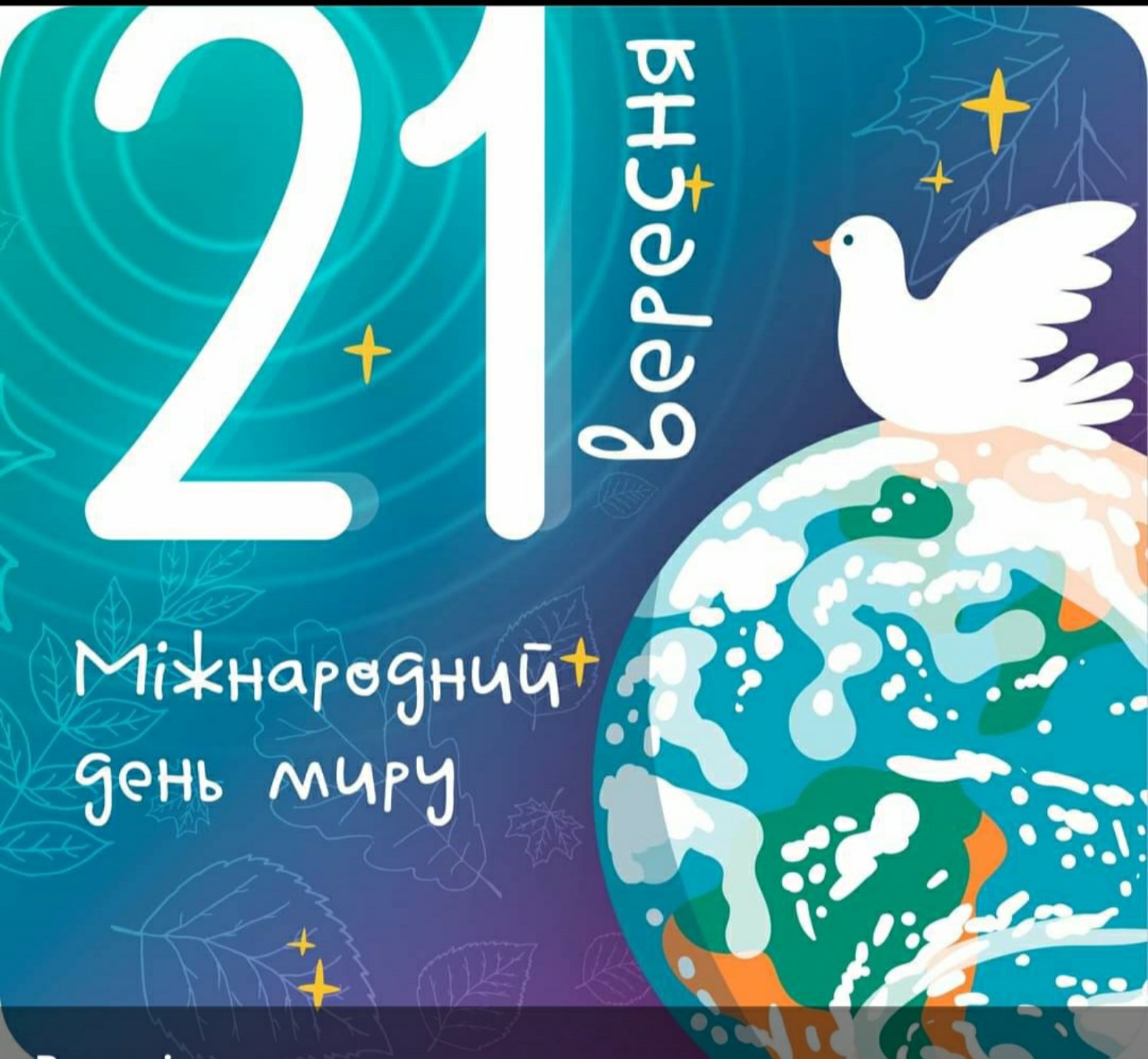 Традиційно 21 вересня в Україні та в усьому світі відзначають Міжнародний день миру. З нагоди цього свята у Дуб'євському НВК відбулася тематична інформаційна бесіда «Діти України за мир!» Адже сьогодні мир в Україні не є абстрактним бажанням, це усвідомлена мета, адже за мирне існування, за право жити у власній державі триває боротьба на сході країни. Міжнародний день миру - цей день не тільки заклик до припинення насилля, але й спроба сказати головне - люди не мають бути ворогами одне одному. Заклики до миру стали темою тематичних виховних годин, які провели класні керівники Дуб'євського НВК з нагоди цього дня.