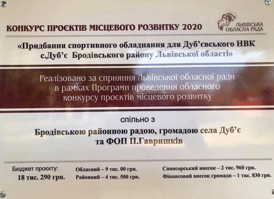 В рамках проєкту місцевих ініціатив у Дуб’євському НВК реалізовано ще один проєкт «Придбання спортивного обладнання для Дуб‘євського НВК с. Дуб‘є Бродівського району Львівської області», за рахунок якого в спортивному залі встановлено шведську стінку укомплектовану(лавка для пресу і штанги, перекладина, драбина, бруси-стійки для штанги, мати) , а також тенісний стіл укомплектований.