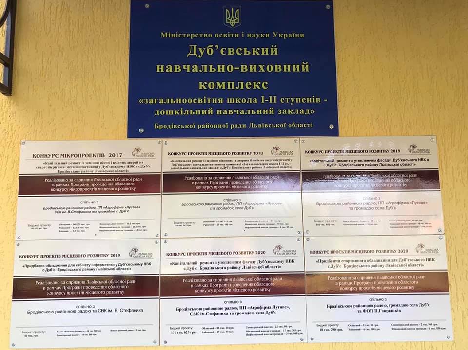 Здійснено реалізацію проєкту місцевого розвитку 2020 «Капітальний ремонт з утепленням фасаду Дуб'євському НВК с.Дуб'є Бродівського району Львівської області»