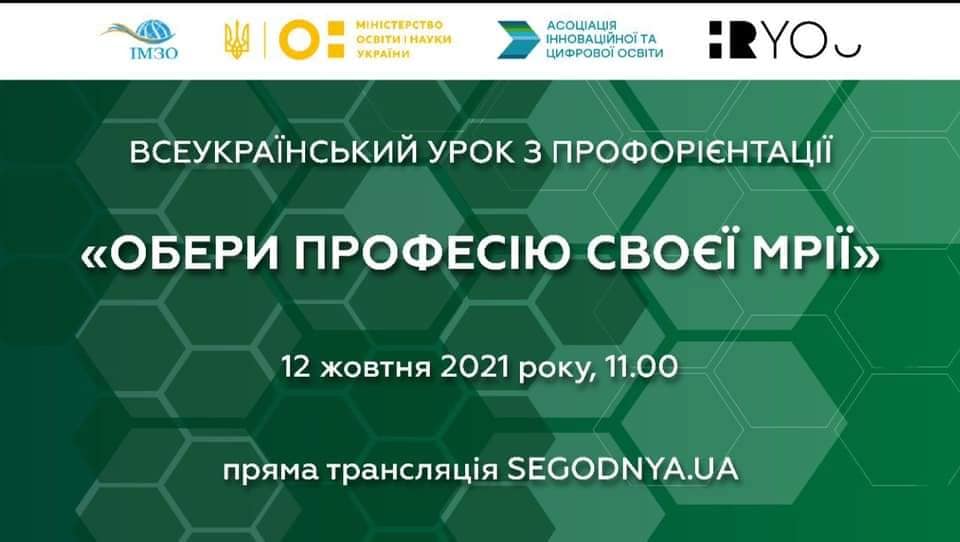 У вівторок, 12 жовтня 2021 року, учні 8-9 класів взяли участь у першому Всеукраїнському онлайн-уроці профорієнтації для учнів в рамках реалізації проєкту з профорієнтації та побудові кар’єри «Обери професію своєї мрії».